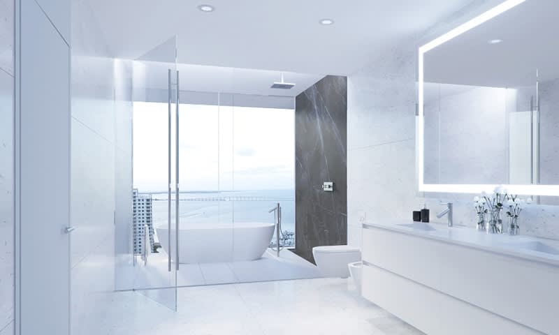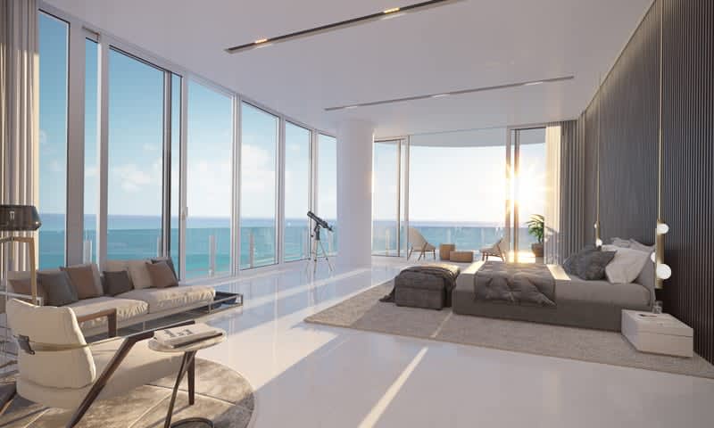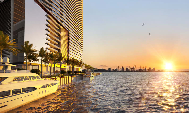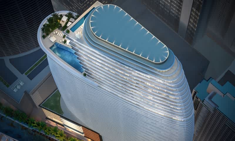 The Aston Martin Residences is a 66 story sail-shaped building, with 490 feet of water frontage. It offers private lobbies, fitness center with spa, an infinity pool on the 55th floor, a yacht marina, Miami River views and more.